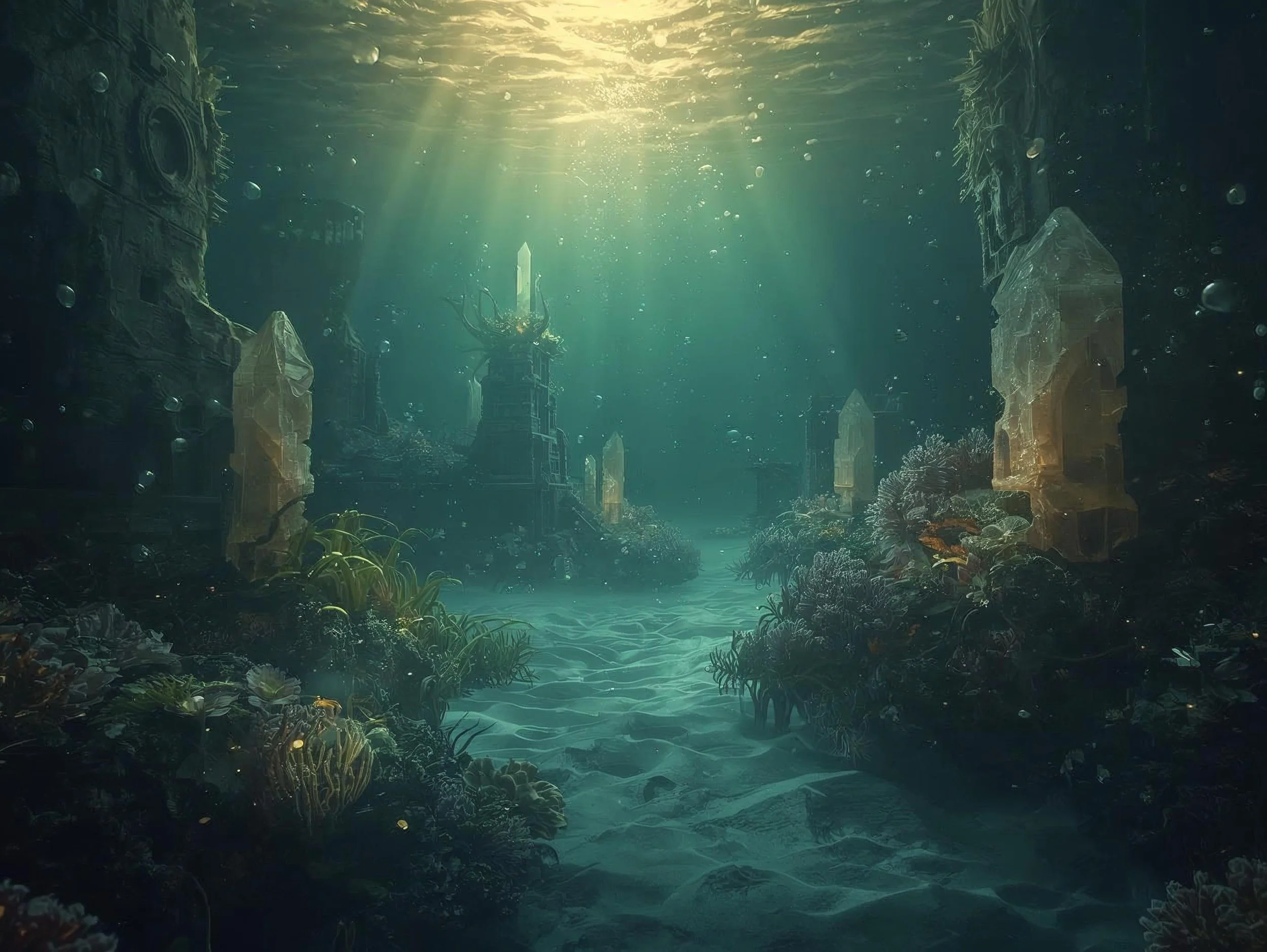 “Here, in the stillness of the deep, ancient truths linger. Crystals hum with memory. The sea holds what was lost — not in grief, but in sacred remembrance. Let the waters guide you home.”